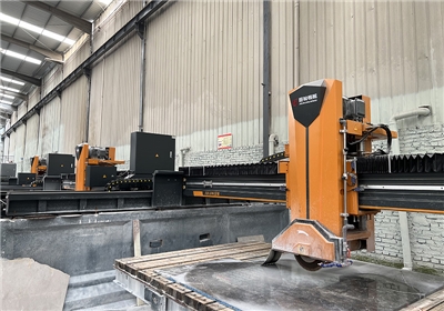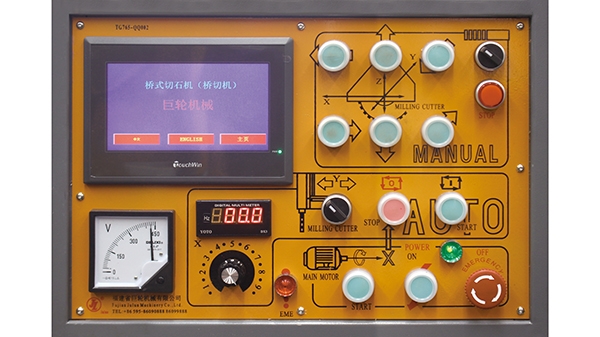 該機采用 PLC 可編程系統(tǒng)和人機操作界面,輔以高精度旋轉編碼器定位及紅外標線儀。左右走刀采用變頻器控制,加上結構優(yōu)化升級,左右走刀速度可大大提升,提高產能;上下升降采用液壓升降,結合厚鍍鉻導柱+耐磨導套,配合間隙小,耐磨精準;主軸箱配套優(yōu)化升級,可兼容高轉速;關鍵部位均采用進口零配件,因而具有切割效率高、切割精度高、穩(wěn)定性高、操作簡便等優(yōu)點,特別適用于花崗巖、大理石、巖板等板材的切割。